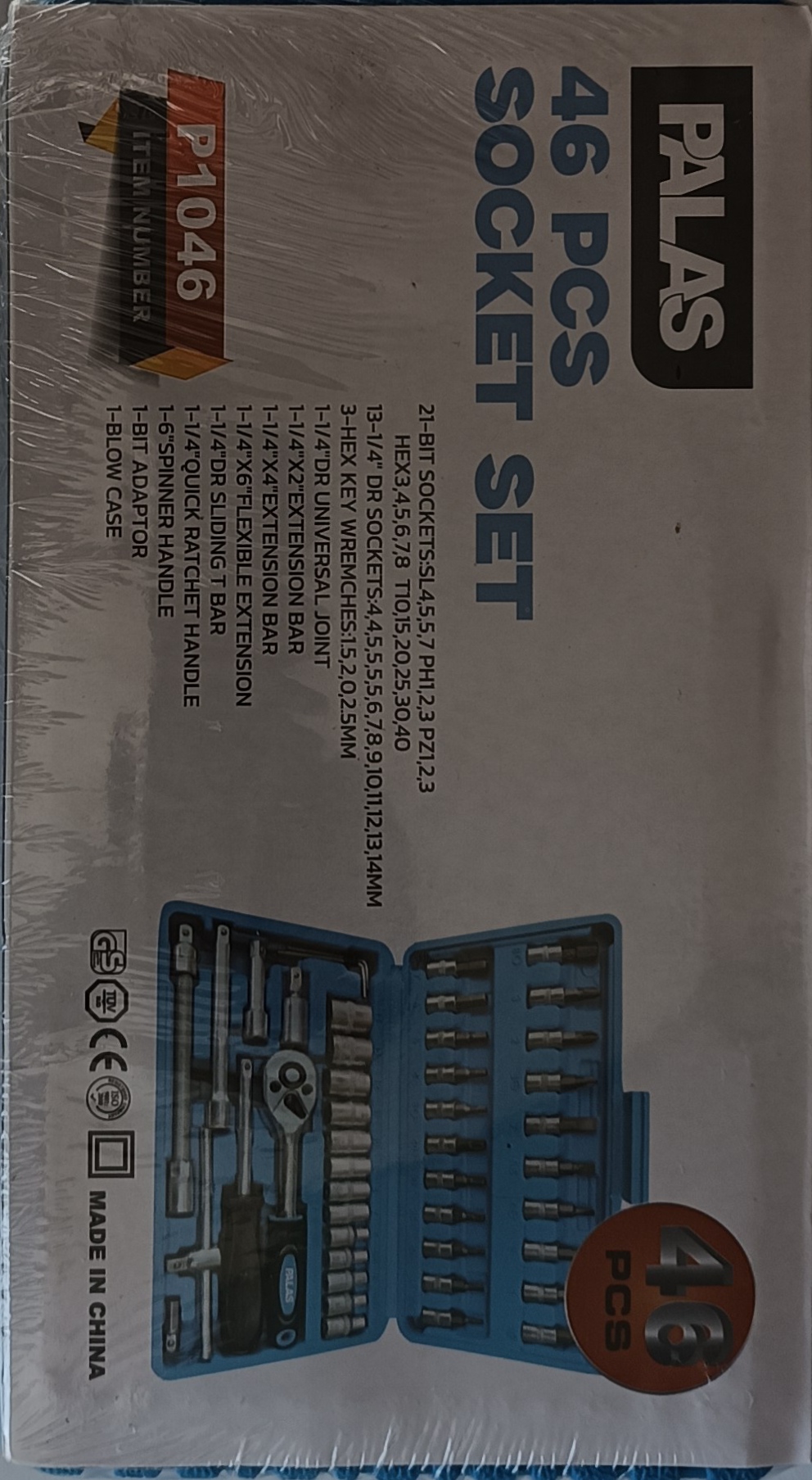 جعبه بکس 46 پارچه آبی پالاس دارای 20 مدل بیت بکس است که شامل 3 عدد چهار سو چهارپر ، 3 عدد چهارسو شش پر ، 3 عدد دوسو ، 6 عدد تی به شماره های 10 ، 15 ، 20 ، 25 ، 30 و 40 و شش عدد شش پر به شماره های 4 ، 5 ، 6 ، 7 و 8 است. همچنین 13 عدد بکس درایو 1/4 به شماره های 4 ، 4/5 ، 5 ، 5/5 ، 6 ، 7 ، 8 ، 9 ، 10 ، 11 ، 12 ، 13 ، 14 و 3 عدد آلن ریز و یک عدد لقلقه ، دسته جغجغه ، کمک کوتاه ، کمک بلند ، کشویی ، رابط فنری و یک عدد مغزی بکس که همگی درایو 1/4 هستند در این ست وجود دارد.